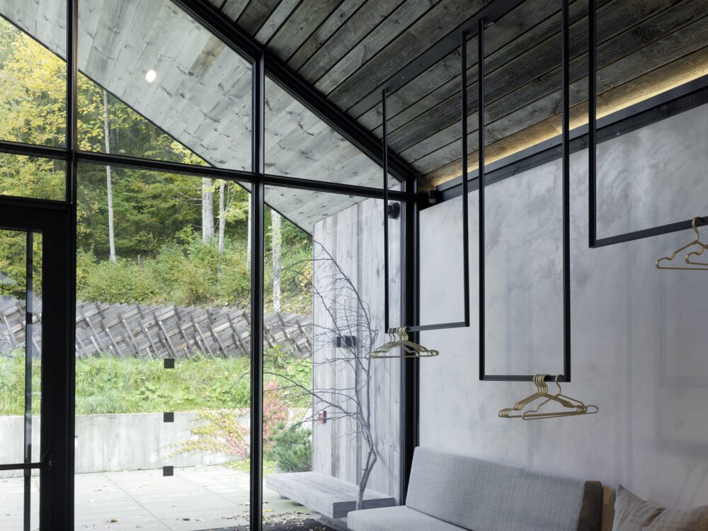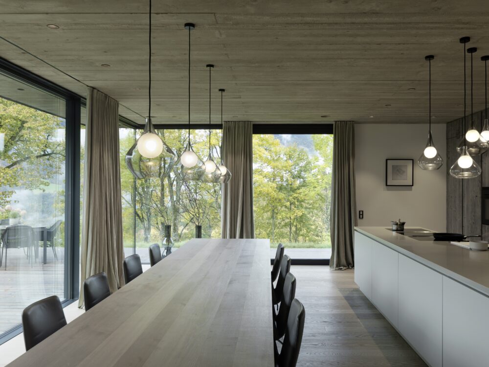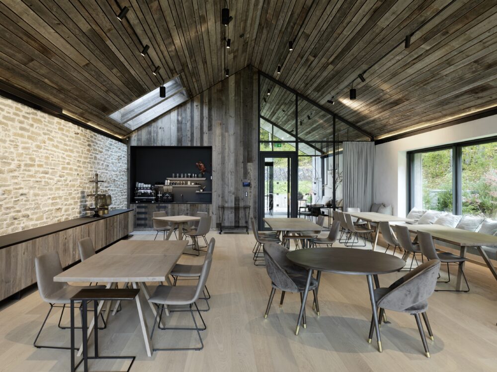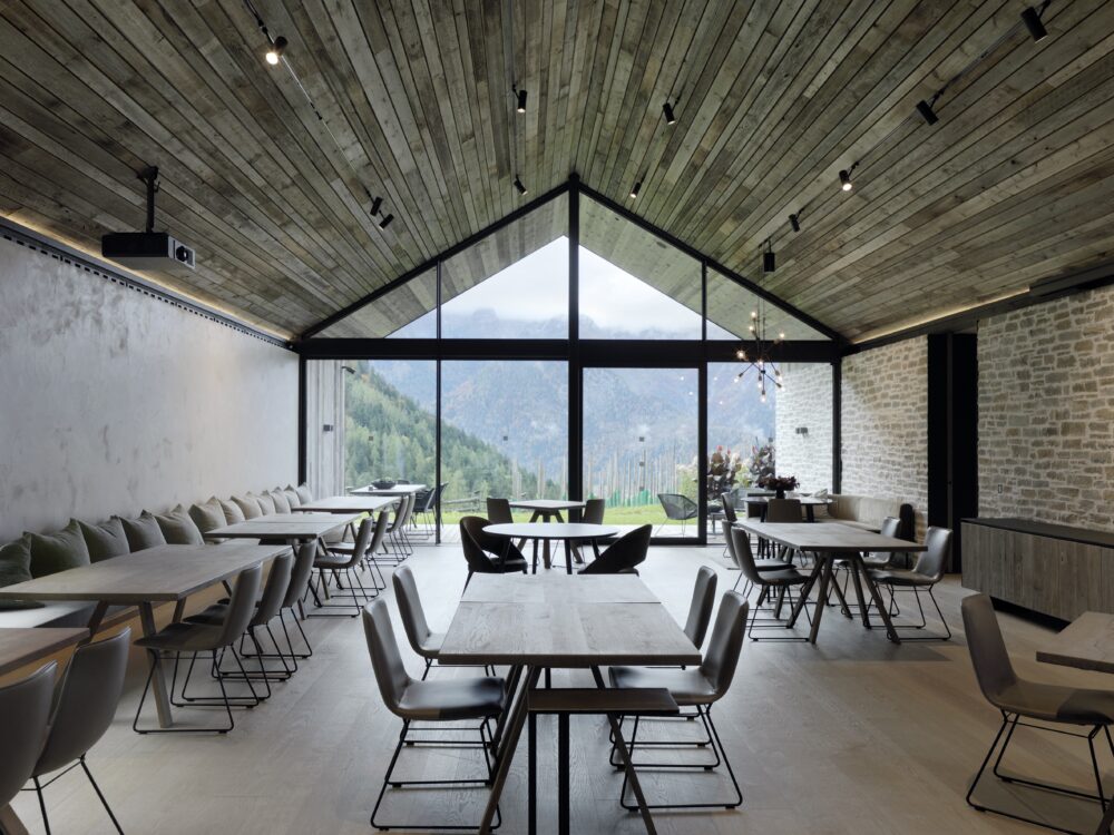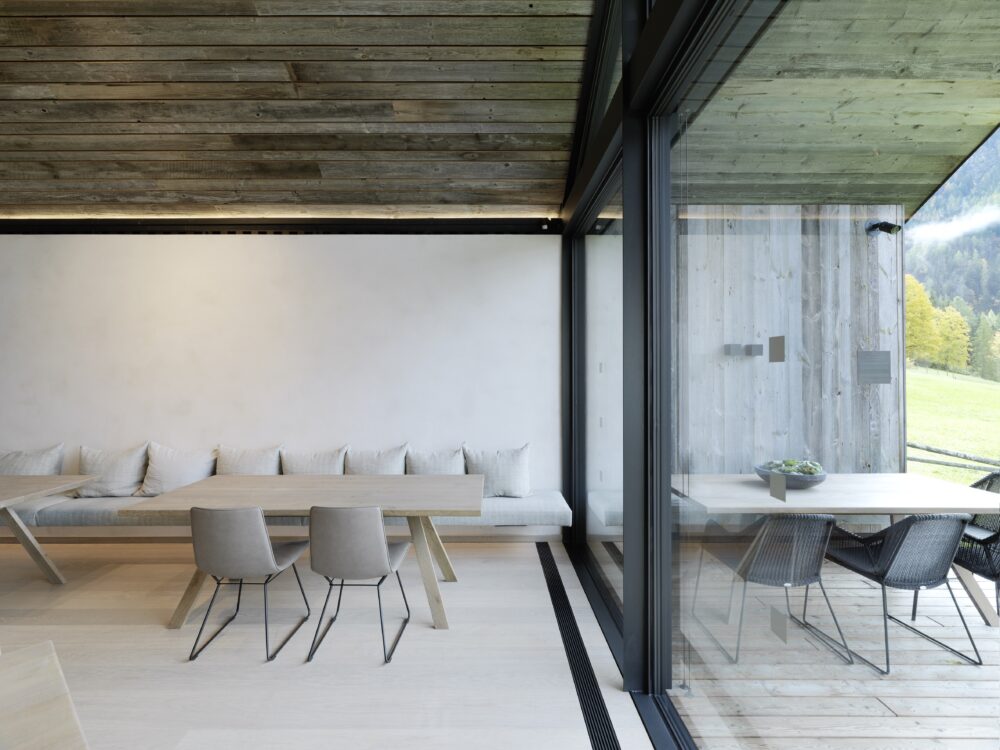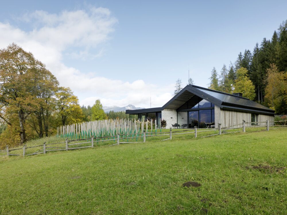 Die Architektur hält sich zurück – ein archaisches, steil geneigtes Satteldach öffnet einen Panoramablick auf die Loferer Steinberge, sie rahmt den Ausblick und holt Naturfarben, Stimmungen aller Art in den Seminarraum, der sich so ständig verändert. Im Anbau findet eine offene, intime Küche Platz, die Decke in Sichtbeton mit Holzmaserung gestaltet. Sonnenverbranntes Holz, Beton, Rauriser Stein – einfache Materialien aus der Region verschmelzen zu einer Einheit und schaffen gemeinsam ein stimmungsvolles Ambiente.