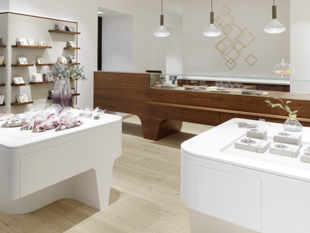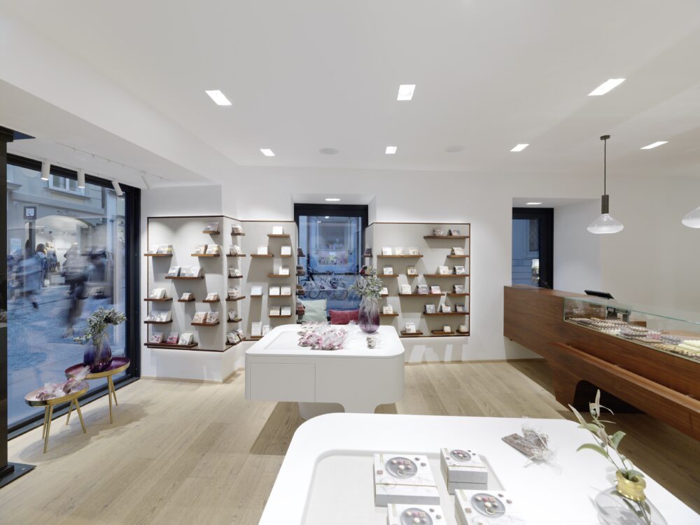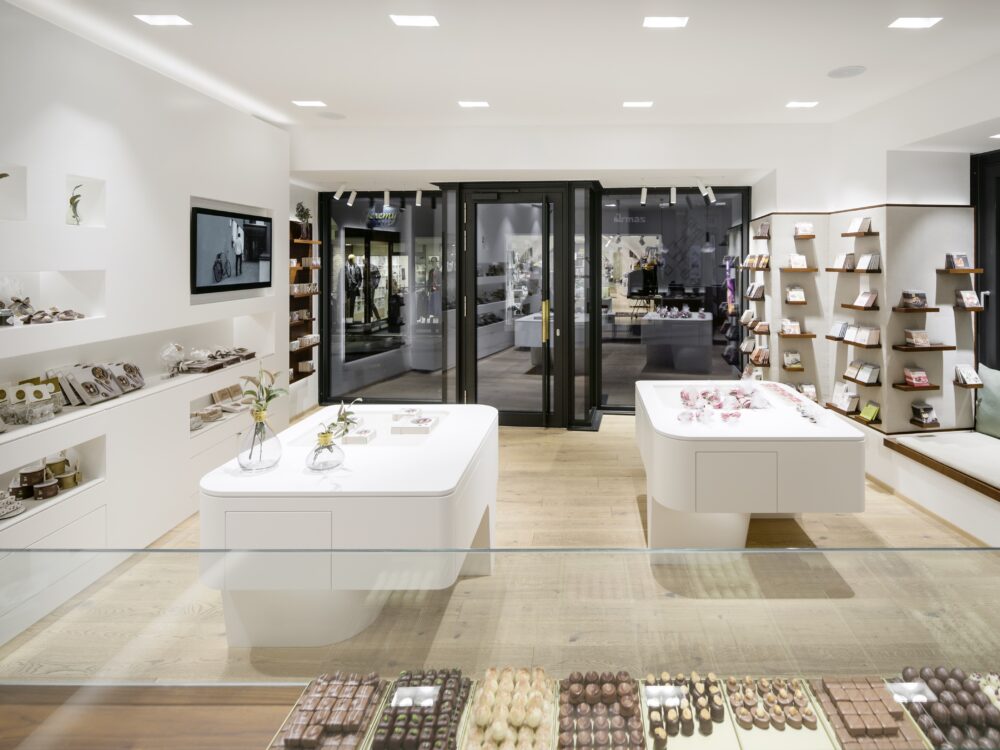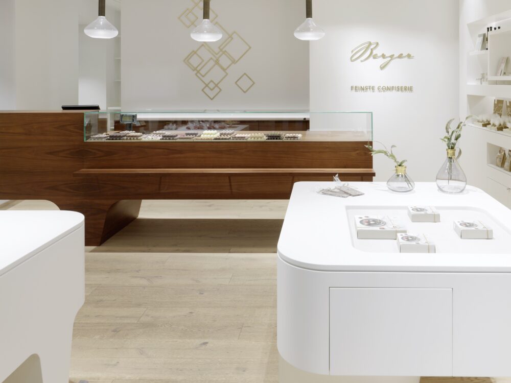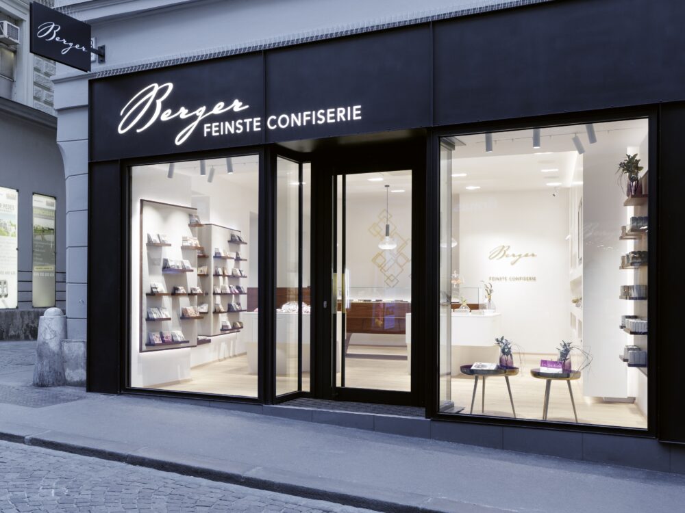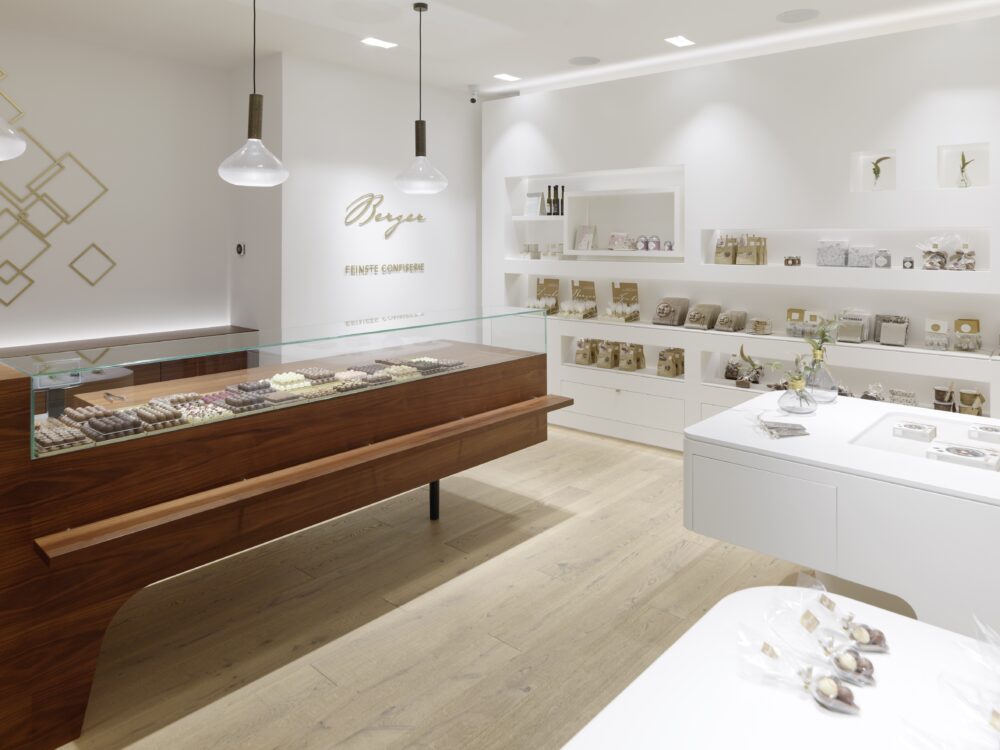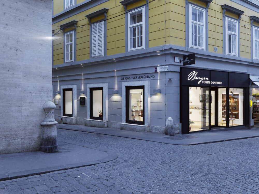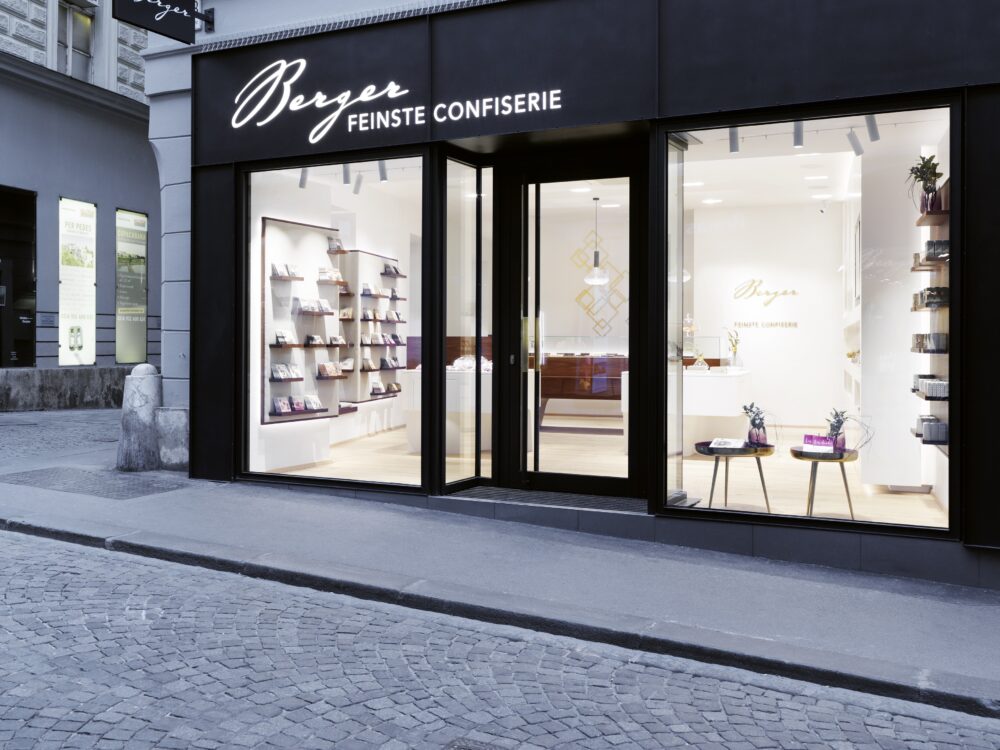 Seit 25 Jahren begleiten wir den stetigen Aufstieg der Firma Berger Feinste Confiserie aus Lofer und entwerfen die architektonische Verpackung des süßen Genusses – erstmals auch in Graz – an der Ecke Sporgasse / Färbergasse, einer der prominentesten Ecken der Grazer Altstadt (UNESCO Weltkulturerbe).