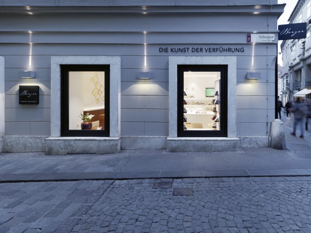 In 2 Monaten entstand aus einem Modegeschäft eine neue Stätte der Verführung mit neuer Fassade aus Schwarzstahl, wieder geöffneten Fenstern zur Färbergasse und komplett neuer Innenausstattung in gewohnter Berger corporate identity. Hochwertige Materialien werden zurückhaltend eingesetzt und ziehen nicht zuletzt durch eine gezielt eingesetzte Beleuchtung Besucher, Kunden und Interessierte in den Shop.