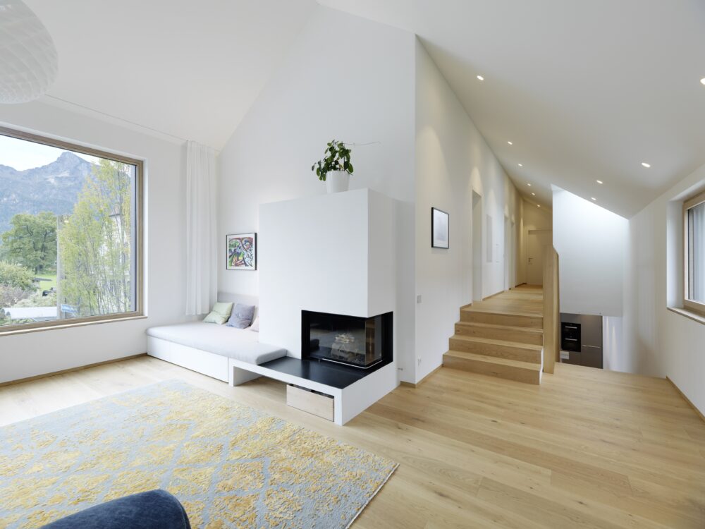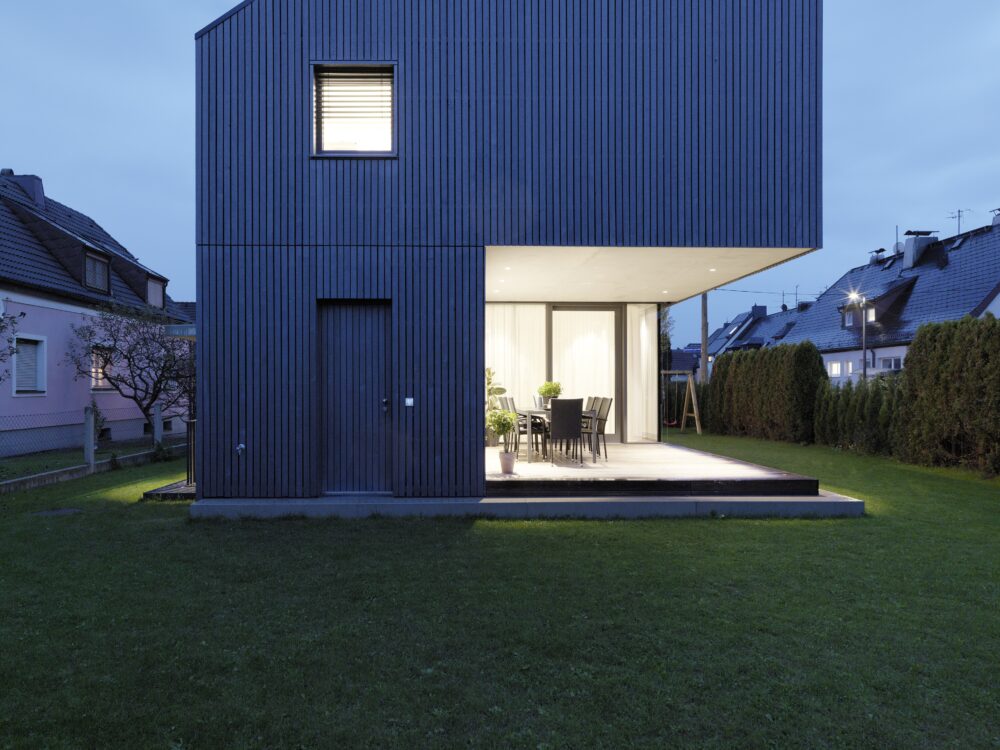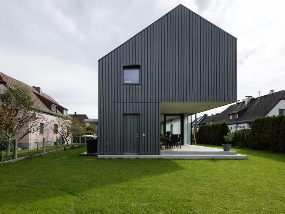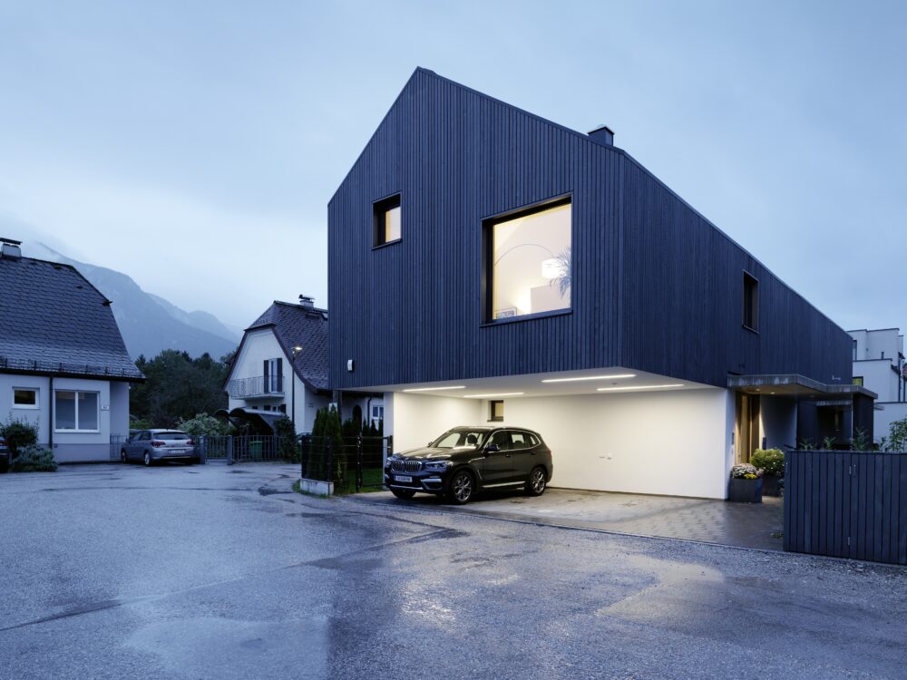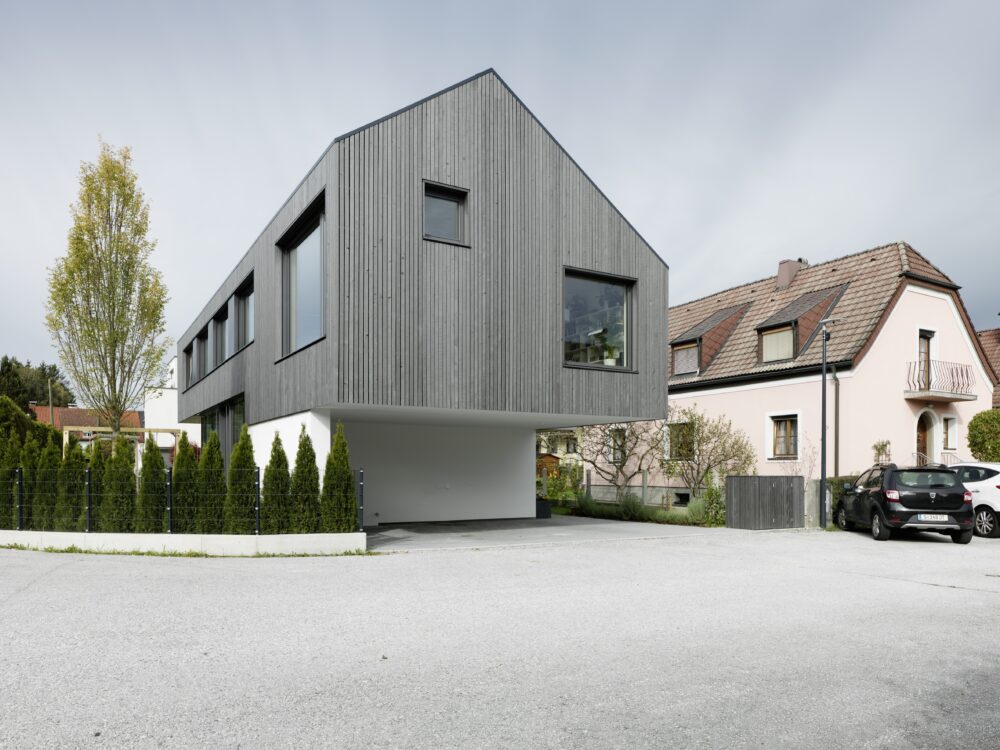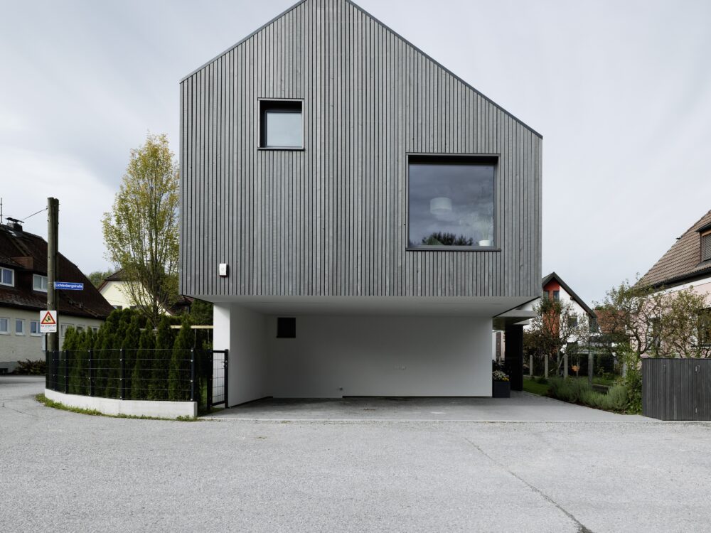 Auf ein Eckgrundstück in einer mit einer durchgehend kleinteiligen Nachkriegssiedlung im Süden Salzburgs implementierten wir einen in West-Ost Richtung langgestreckten, schmalen Baukörper. Dadurch maximiert sich der südseitige Abstand zur Straße und es gelang, die Dimension der historischen Nachbargebäude fortzuführen. Zwei unterschiedlich hoch gesetzte Traufpunkte führen zusammen mit den beiden auskragende Enden zu einer spielenden Bewegung.