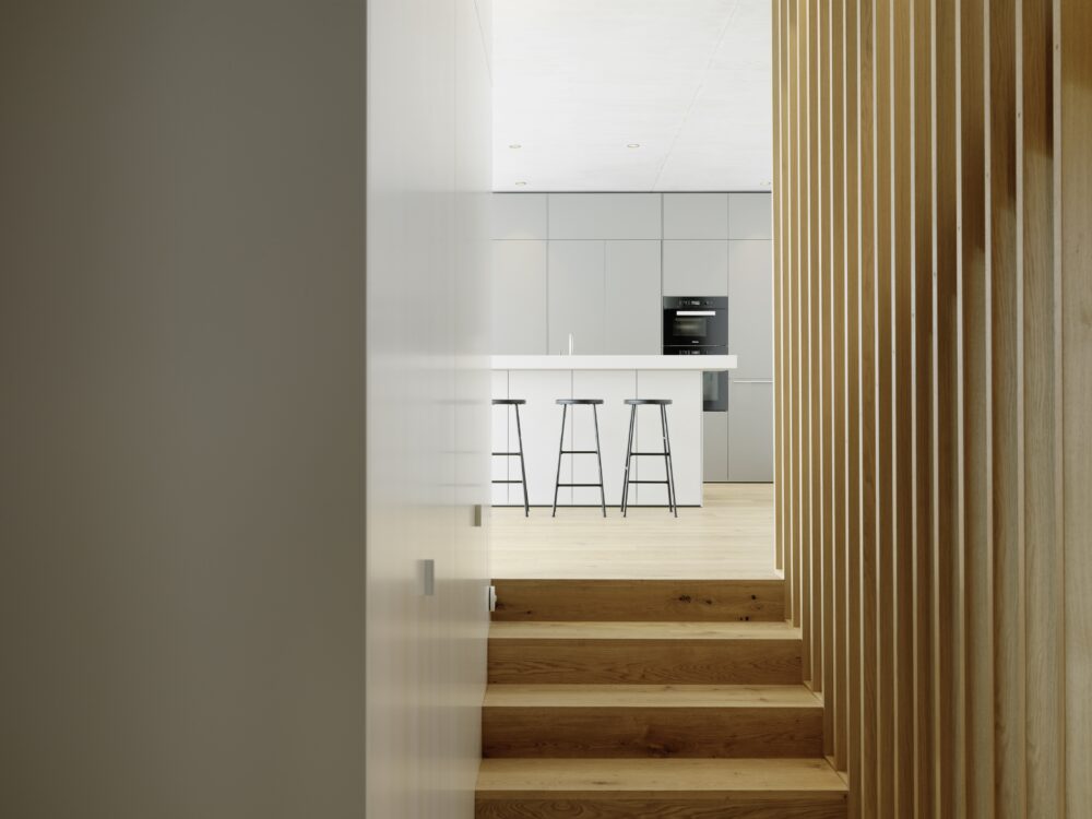Auf Gartenniveau befinden sich Terrasse, Koch- und Essbereich, der Wohnbereich befindet sich abgehoben oberhalb des offenen Carports als Übergangsraum zu den intimen Schlafbereichen. Diese befinden sich auf dem obersten Niveau und erhalten über den offenen Dachraum Volumen und Großzügigkeit.